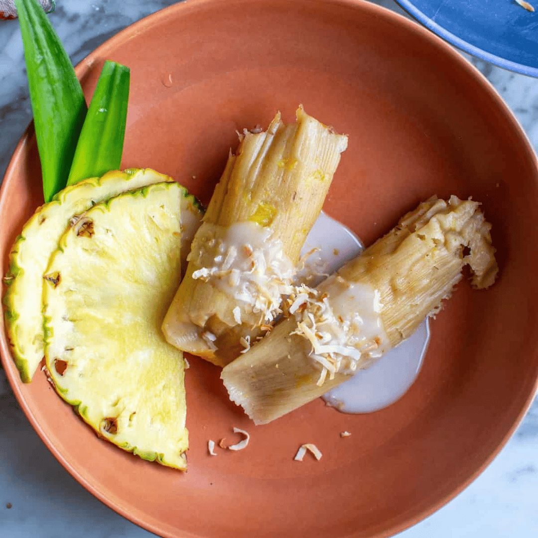 A sweet tamal filled with caramelized pineapple, made with fluffy masa kissed with brown sugar and vanilla. Finished with creamy coconut sauce and toasted coconut, it’s a piña colada in tamal form! 😋