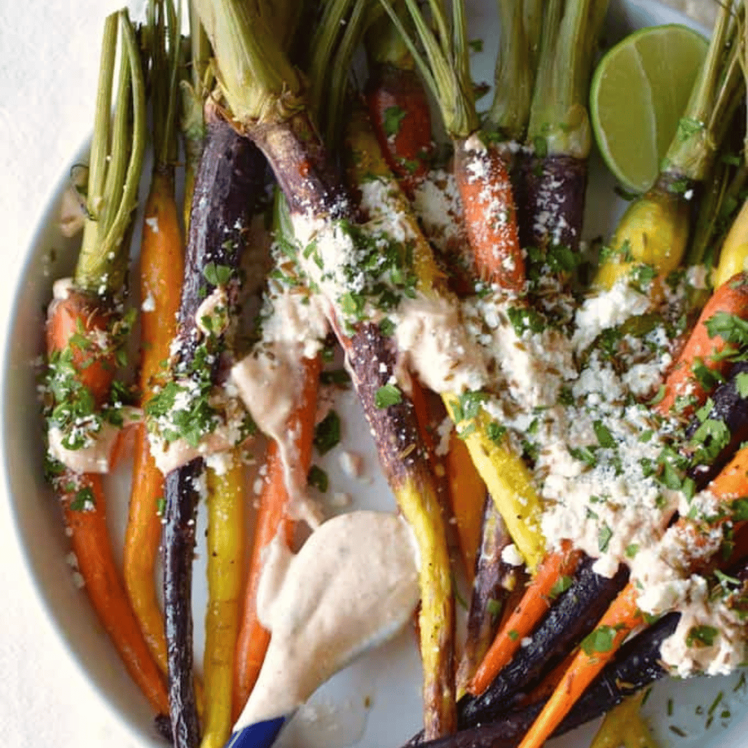 Sweet roasted carrots topped with creamy, zesty street-style toppings. 😊