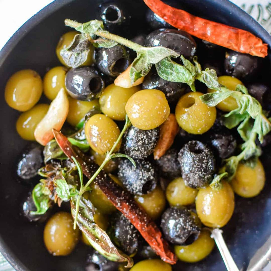 Warm olives with garlic, herbs, and chile flakes—perfect for snacking or entertaining. 🍹 Something Fun to Sip