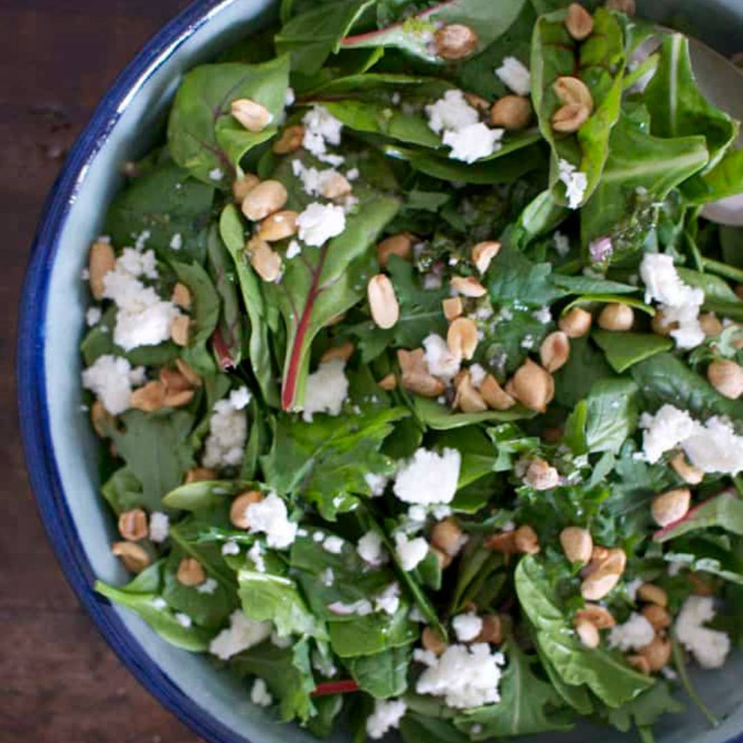 Tender kale tossed with crunchy peanuts, creamy queso fresco, and a zippy dressing.